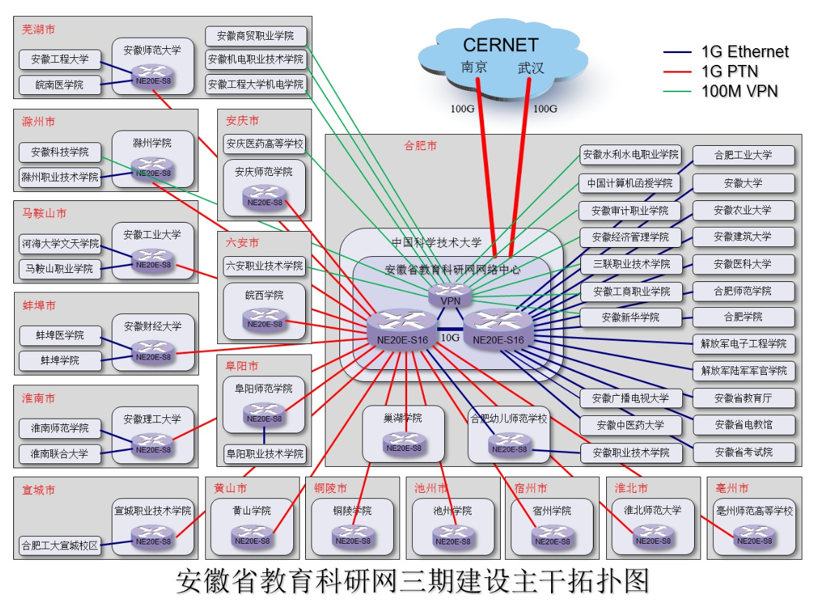 2002年底,教育厅出台《安徽省教育信息化三年实施意见》,明确由365bet体育在线官网网络中心负责实施省域主干网建设工程,扩建合肥市教育城域网,并在合肥以外的16个省辖市设立省网主节点,与位于合肥的省网中心通过南北两个155M光纤信道形成环网互连,实现了覆盖全省17个市的主干网。省域主干网自2004年建成并投入使用。实现了高校网络之间的互联互通、资源共享,推动了各校的科研和教学。
